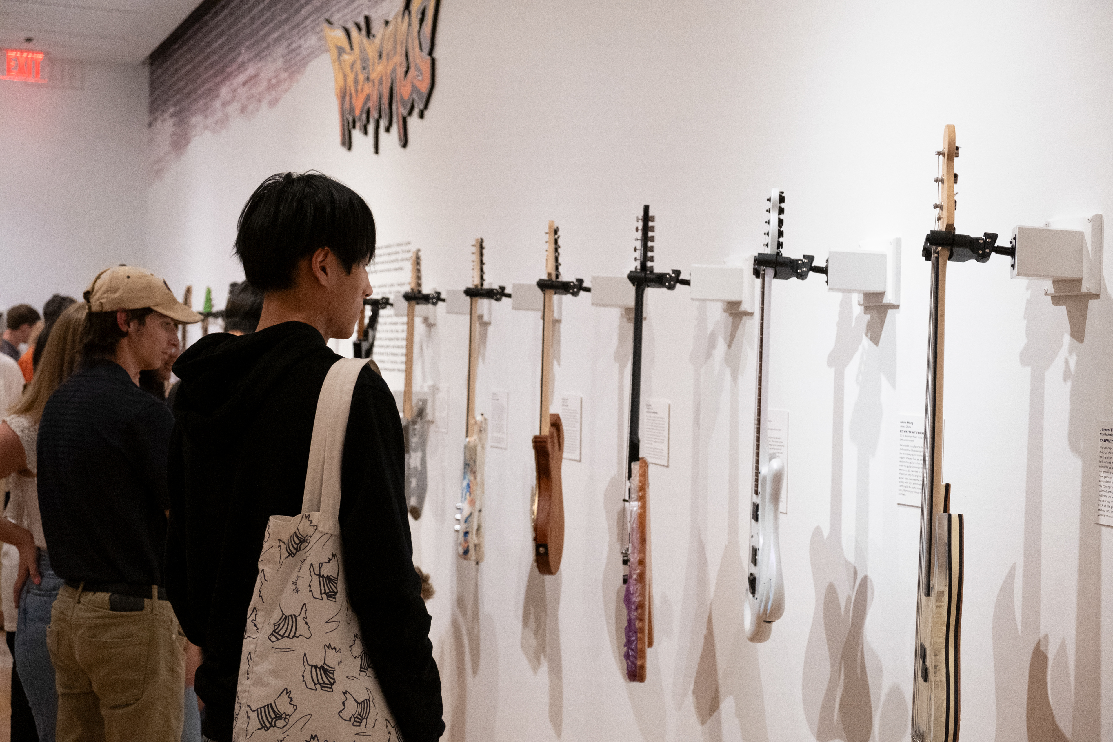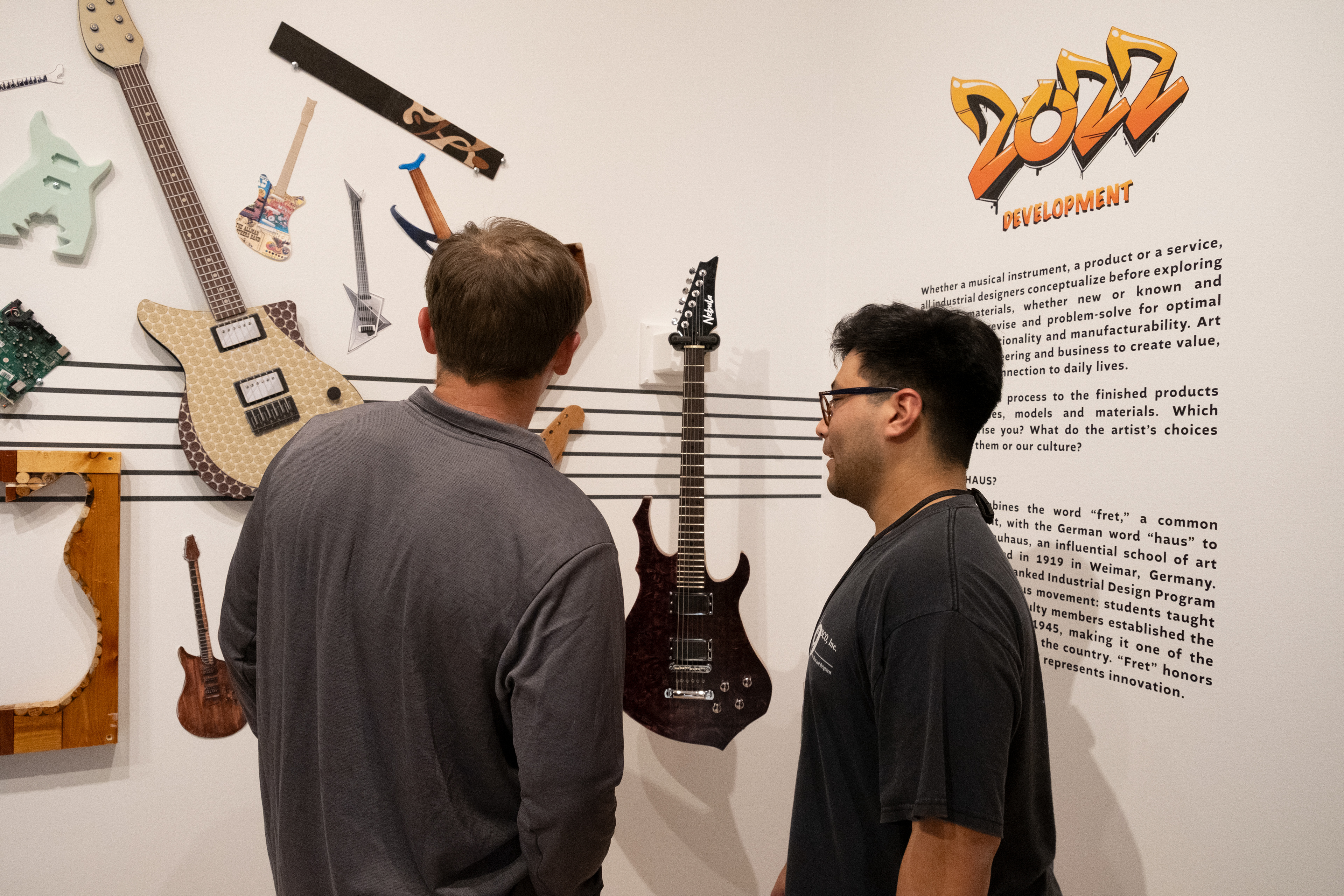 Auburn University’s own fine art museum hosted the FretHaus 2022 exhibition. The show featured the new guitars designed and built by the current FretHaus students and included guitars from years past. The show began the semester before with a development wall that showed the current sketches and models from the students in real time. At the end of the semester there was an opening with live music and was crowded with family, friends, and the Auburn community. Thanks to the great staff at the Jule for helping us and hosting our event!