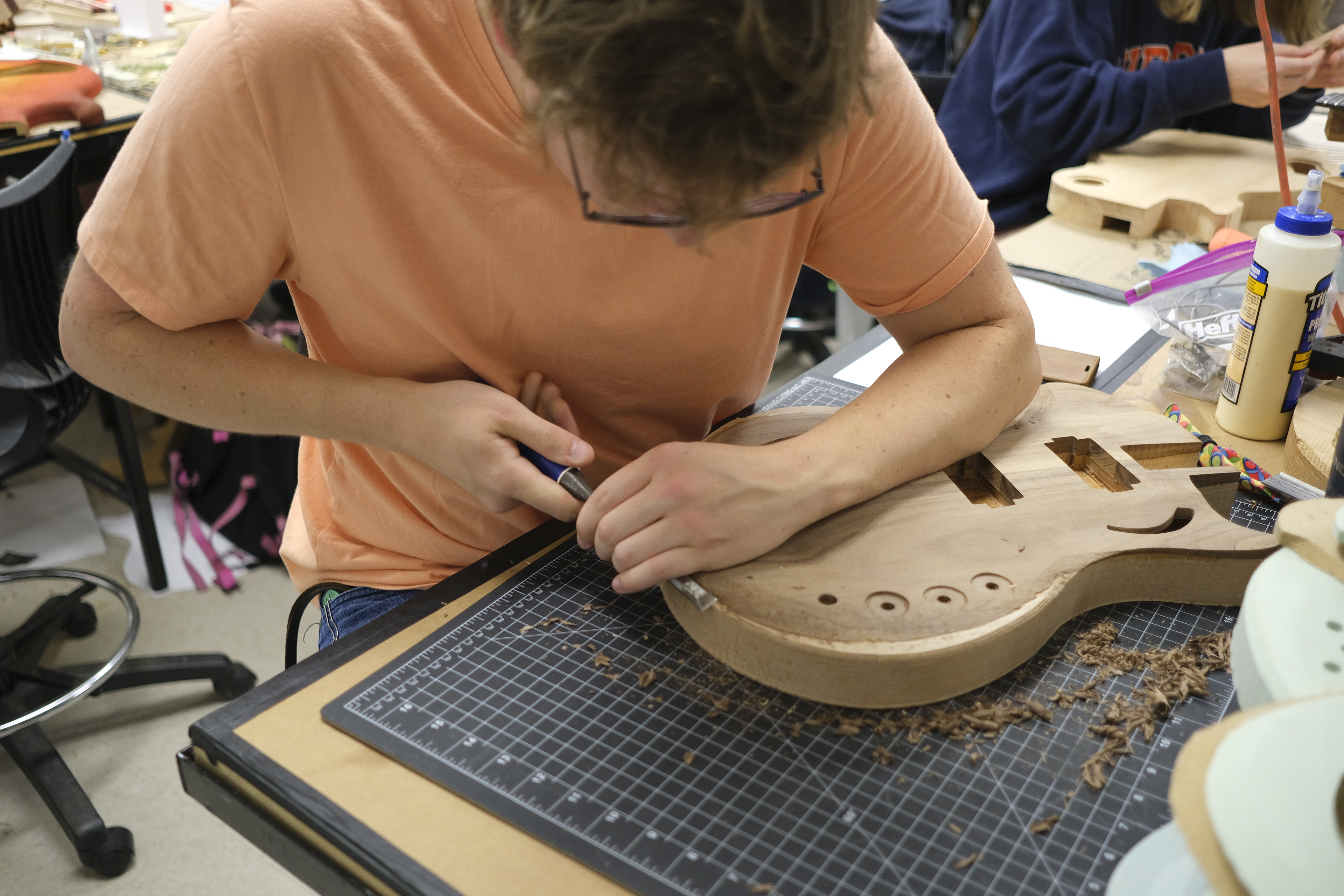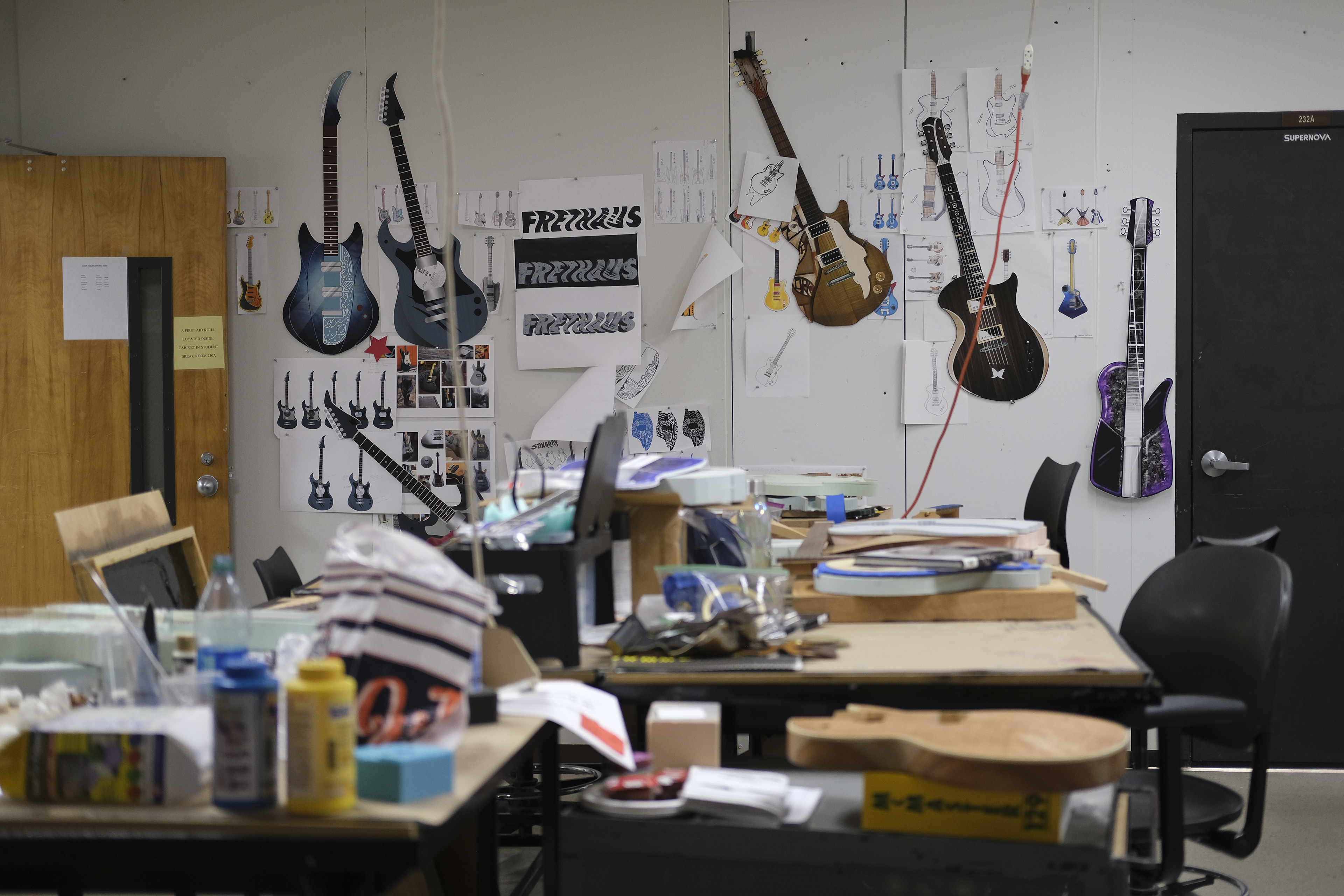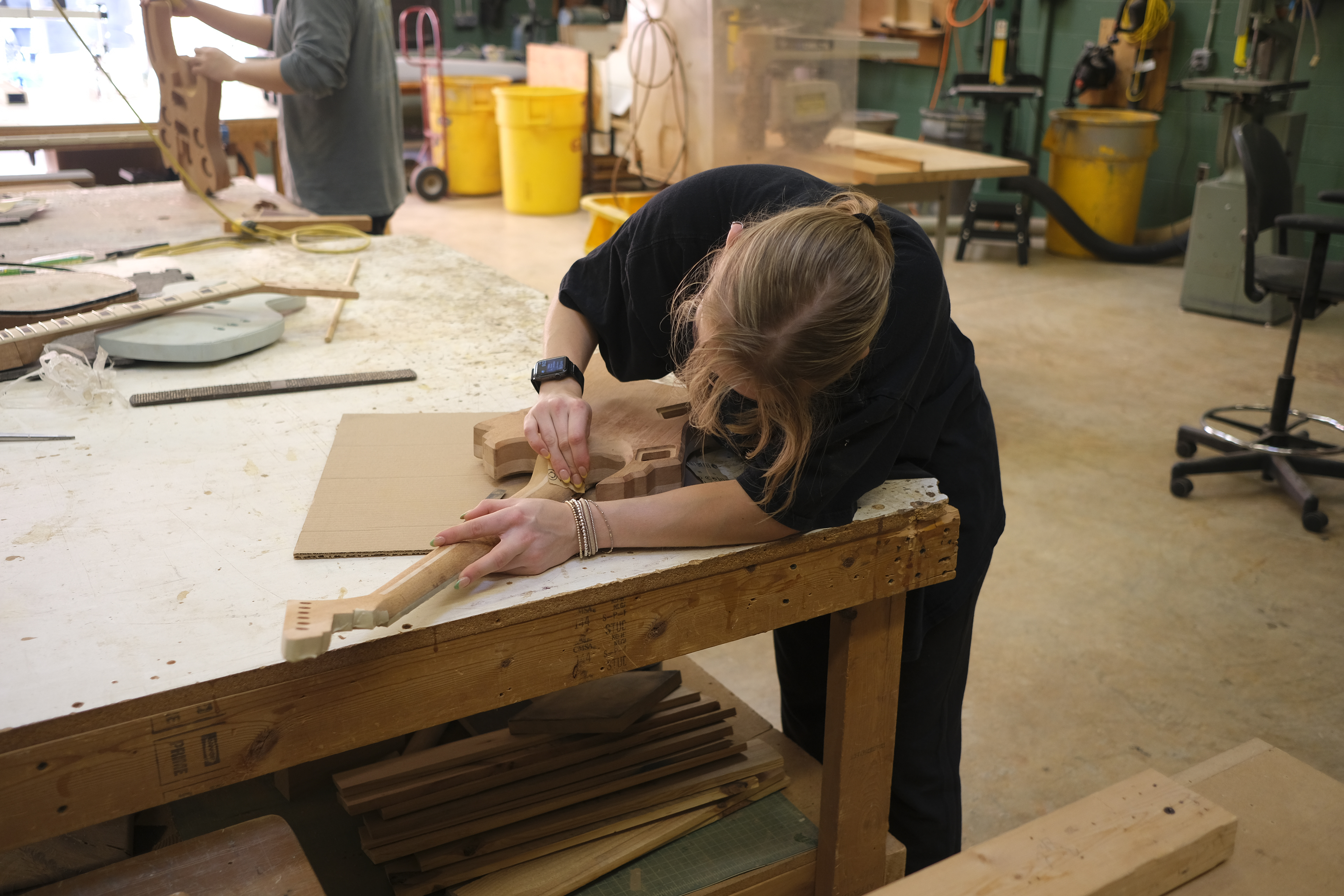 Early in the semester the FretHaus students met with Gibson CEO Cesar Gueikian and the staff to learn more about the history and brand of Gibson. Students developed guitars through their own inspiration while keeping that "Gibson Nugget" in mind. Gibson hosted the students at the end of the semester at the Gibson Garage in Nashville to present their designs on the stage. Many thanks to the Gibson team for hosting the 2023 show!